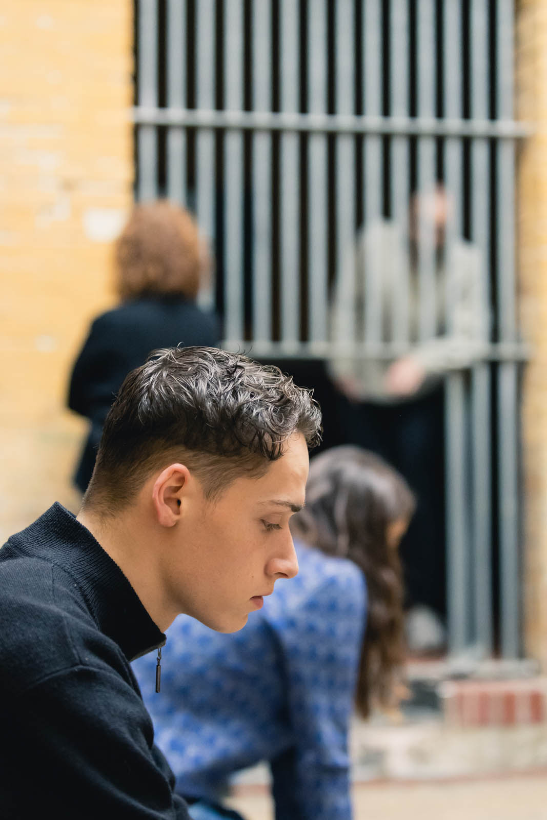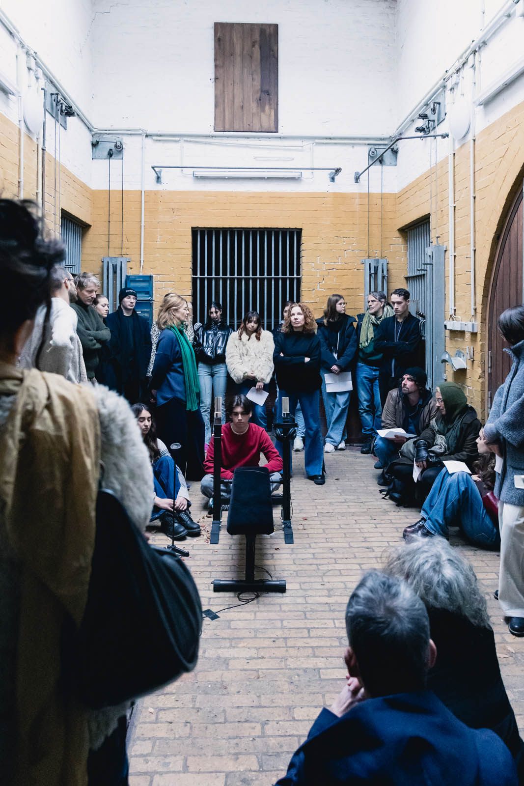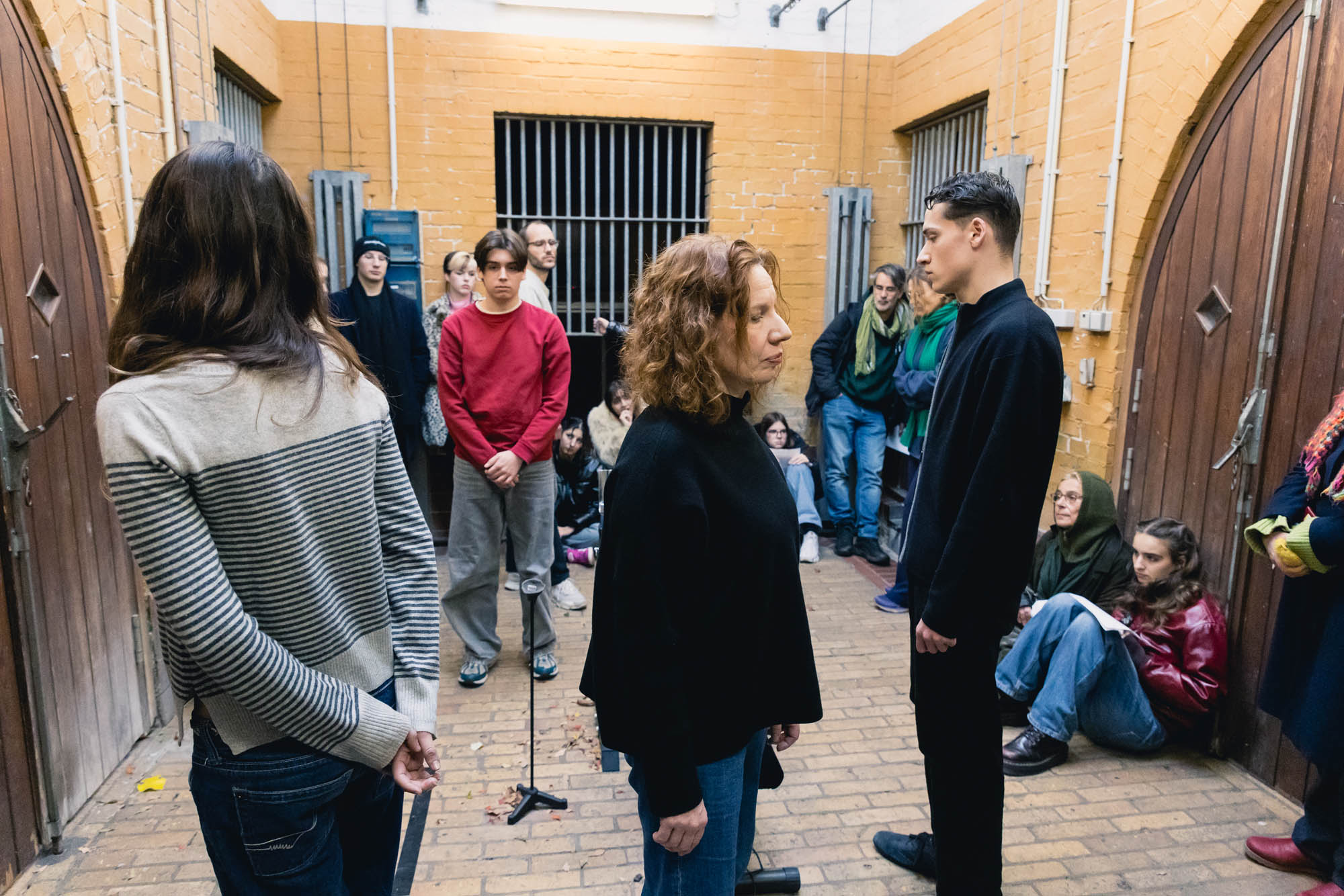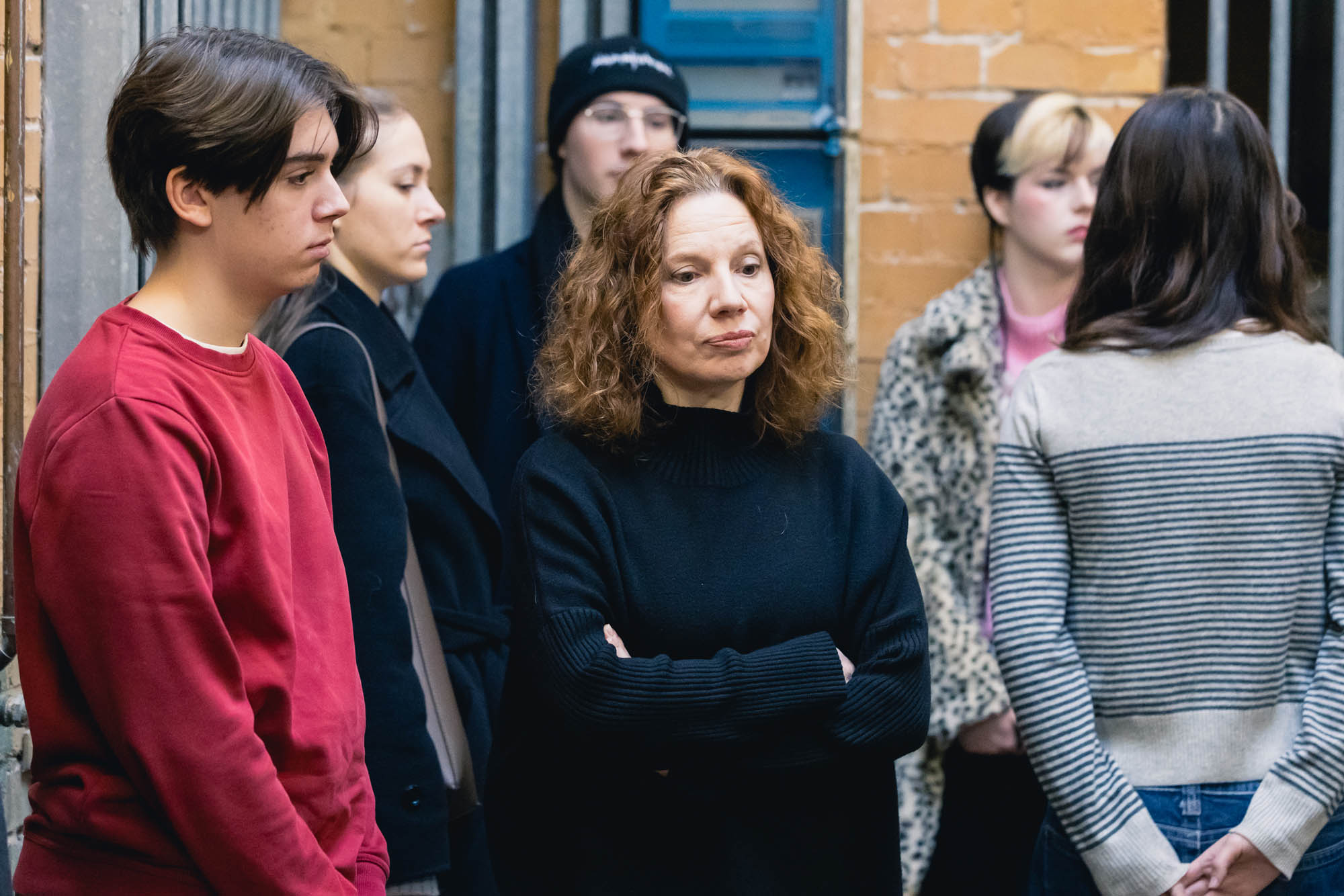 The performance “Wir Sind Fünf” (‘We Are Five’) is based on the text ‘Gemeinschaft’ (‘Community’) by the writer Franz Kafka: ‘We are five friends, we once came out of a house one after the other […] Since then we have lived together, it would be a peaceful life if a sixth one didn’t keep interfering […]. He doesn’t do anything to us […]. We don’t know him and don’t want to take him in. The five of us didn’t know each other before, and if you like, we don’t know each other now either, but what is possible and tolerated with the five of us is not possible with the sixth […]. Besides, we are five and we don’t want to be six. […] But no matter how much we push him away, he will come back.’ (Franz Kafka – Gemeinschaft) The Six people move, stand still, speak a sentence, sometimes remain silent and change their position. They repeat themselves – sometimes thoughtfully, sometimes angrily. In this way, the group slowly becomes a time-shifted choir, which speaks of five, although six are present.